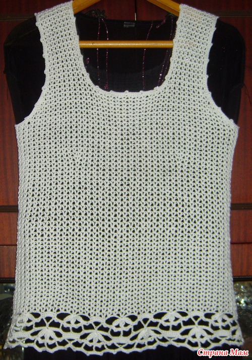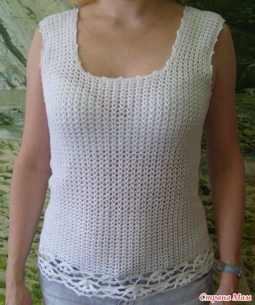 Летняя майка из нарцисса подойдет на любой возраст и для любой ситуации. Почти не просвечивается, что актуально для полных женщин. Можно одеть одну майку, можно под пиджак или более "дырявый" кардиган. Основное полотно вязала столбиками с накидом, между ними воздушная петля. схема каймы. Читать полностью