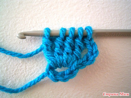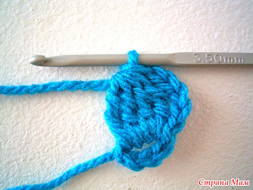 Связать цепочку из 8-ми петель. Далее- 5 воздушных петель для подъема. Затем, 4 столбика с накидом, провязаных вместе
