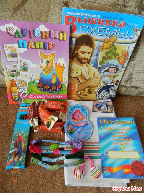 ), 2 открыточки, магнитик, для Полины карандаши и книжечка-вырезалочка склеивать разных зверюшек, бантик.