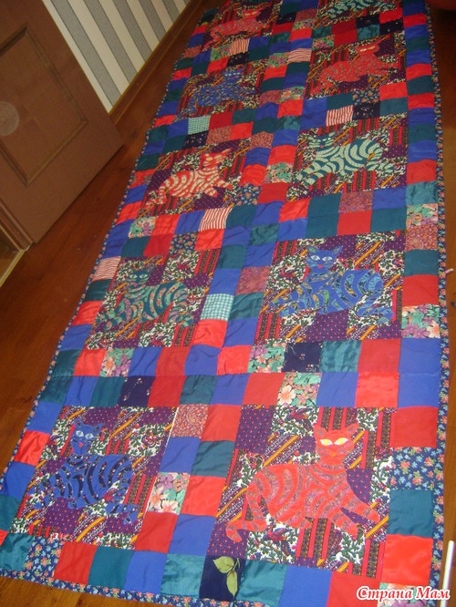 Края делала сборные из квадратов разных остатков и от самих кошек и от всего что нашлось, но именно трех основных цветов - красный, синий и зеленый, всего 200 штук. получилось 10 блоков. простегивала после сборки вручную.
