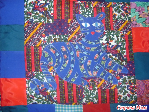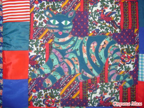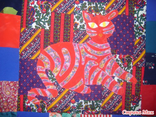 Основной лоскут был сам как пэчворкский, поэтому кошек делала из однотонной ткани. полоски нашивала как аппликацию из узорчатой, все кошки разные, ни у одной кошки полоски по расветке не повторяются.