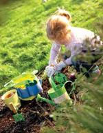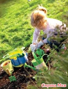 Купите ребенку небольшую лопатку, тяпку, лейку. Инструменты ребенка должны быть легкими и удобными, а ручка короткой. Поэтому лучше покупать их вместе с крохой, так вы сможете примерять насколько удобно «орудия производства» ложатся в маленькую детскую руку, насколько они удобны для работы.