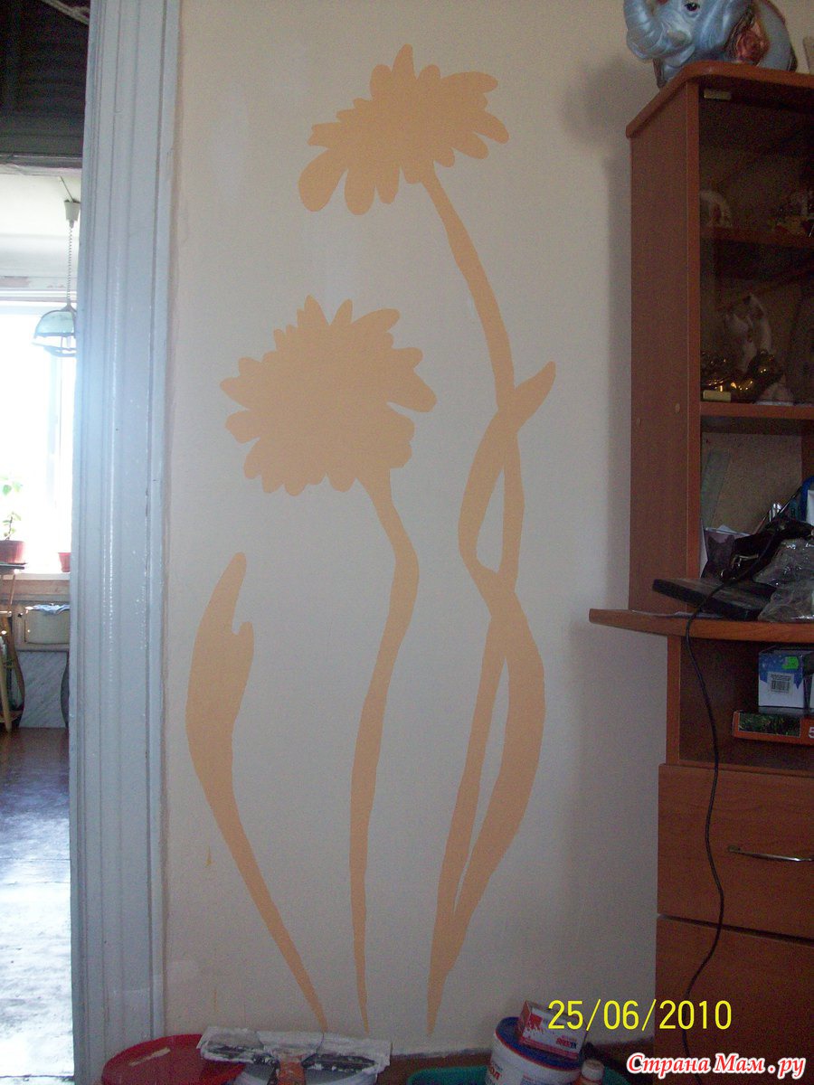Насмотрелась Квартирного вопроса по НТВ там все клеят на стены наклейки. И решила себе сделать такое же. Наклейки у нас не продают. Поэтому сделала трафарет и нанесла рисунок на стену водоэмульсионкой с добавлением акрилового колера. Вот такие получились одуванчики.