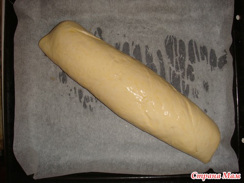 скрутить рулет, выложить на противень, дать постоять минут 20, намазать яйцом и в разогретую духовку минут на 40