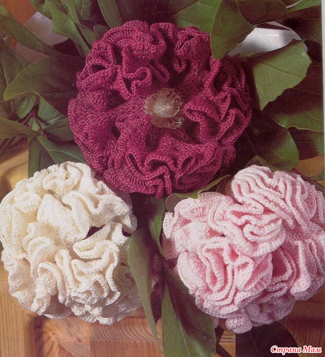 Описание работы: для каждого цветка связать цепочку из 8 возд. п. и замкнуть ее в кольцо с помощью соед. ст. Каждый следующий круговой р. начинать с 3 возд. п. подъема вместо 1-го ст. с накидом и заканчивать 1 соед. ст. в 3-ю возд. п. подъема.