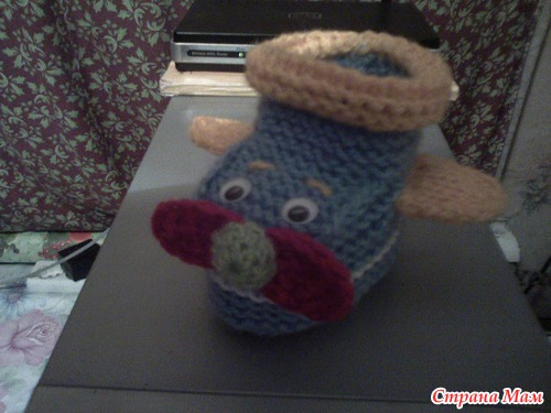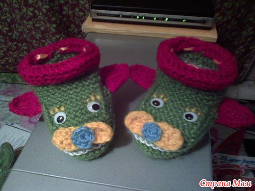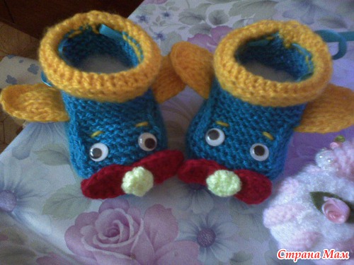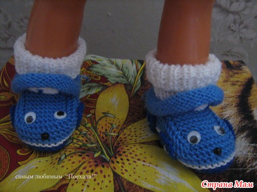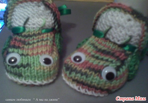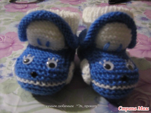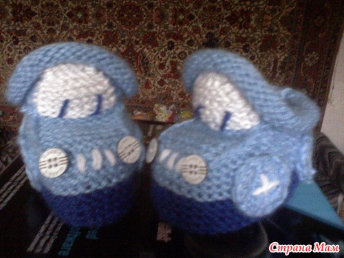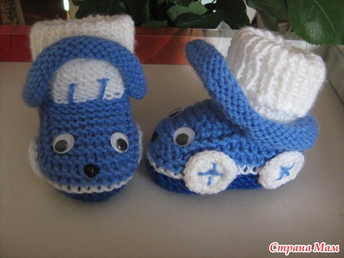 Набирала 35 петель,от размера зависит и от ниток.Далее вязала платочной вязкой. Делала прибавки через ряд,после первой,перед средней,после средней,перед последней петлями.,пока на спицах будет 47 петель-это подошва. Далее провязать ещё 6рядов платочной,затем другим цветом ещё 6-8 рядов.разделить вязание на 3 части 18-11-18.Вязать,как пятку у носка,пока с боков останется по11-12петель.Боковые петли оставить,а на средних 11п вязать "стекло"6-8 рядов,затем убавить петли стекла до 7п.Затем поднять5-7 петель по боковой стороне стекла,потом 7 петель открытых,потом ещё петли по боковой стороне и отложенные 11или12п.Затем вязать отворот лицевой гладью на всех петлях:11(12)-5(7)-7-5(7)-11(12).Вязать 8-10рядов.Петли закрыть,рулик сам закрутится.Вдеть шнурочек,чтобы не было его заметно,завязкой сзади,украсить на свой вкус. Вышить дворники,радиатор и.т.п. Если вязать с имитацией носочков, то до сшивания пинеток, набрать по изнанке петли , вязать резинкой на нужную высоту. И ещё, если делать рулик, то будет зимний вариант, а если вместо рулика провязать 2 ряда платочной вязкой,и закрыть, то получится облегчённый вариант- кабриолет.