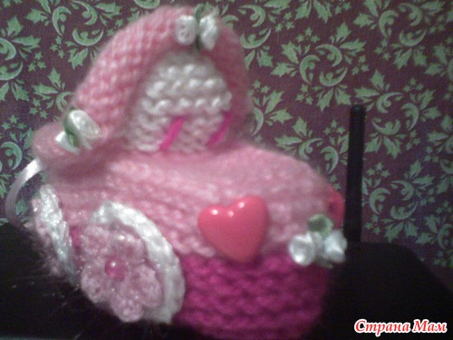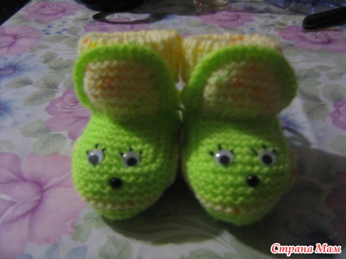 Набирала 35 петель,от размера зависит и от ниток.Далее вязала платочной вязкой. Делала прибавки через ряд,после первой,перед средней,после средней,перед последней петлями.,пока на спицах будет 47 петель-это подошва. Далее провязать ещё 6рядов платочной,затем другим цветом ещё 6-8 рядов.разделить вязание на 3 части 18-11-18.Вязать,как пятку у носка,пока с боков останется по11-12петель.Боковые петли оставить,а на средних 11п вязать "стекло"6-8 рядов,затем убавить петли стекла до 7п.Затем поднять5-7 петель по боковой стороне стекла,потом 7 петель открытых,потом ещё петли по боковой стороне и отложенные 11или12п.Затем вязать отворот лицевой гладью на всех петлях:11(12)-5(7)-7-5(7)-11(12).Вязать 8-10рядов.Петли закрыть,рулик сам закрутится.Вдеть шнурочек,чтобы не было его заметно,завязкой сзади,украсить на свой вкус. Вышить дворники,радиатор и.т.п. Если вязать с имитацией носочков, то до сшивания пинеток, набрать по изнанке петли , вязать резинкой на нужную высоту. И ещё, если делать рулик, то будет зимний вариант, а если вместо рулика провязать 2 ряда платочной вязкой,и закрыть, то получится облегчённый вариант- кабриолет.