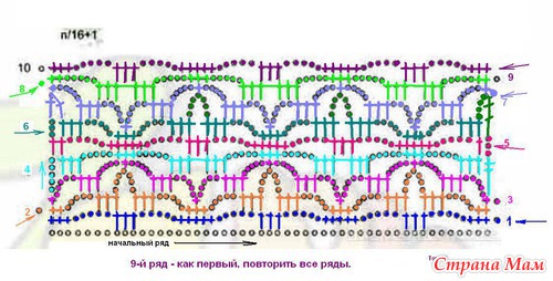 9 р: пропустить первую петлю, ст. сн в след.4 петли, *2 ст. с н в след. арочку из 2-х возд. п, 2 возд. п, пропустить 1 петлю, ст. б н в след. ст. б н, 2 возд. п., пропустить 1 ст. б н, 2 ст. сн в след. арочку из 2-х возд. п., ст. сн в след. 4 петли* ; повторять между * до конца, закончить последний повтор ст. бн в последние 5 петель, 2 возд. п., повернуть.