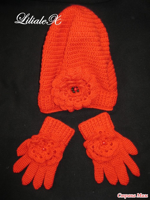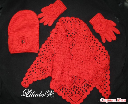 Заказали мне Ташин комплект: https://www.stranamam.ru/post/1580855/ из красной пряжи, и не с митенками, а с перчатками. В результате моего "апгрейда" от Ташиного комплекта осталась только шапочка. С перчатками помучалась... Вязала их одновременно, параллельно, записывая и фотографируя каждый шаг. Попозже в своем дневнике сделаю МК.