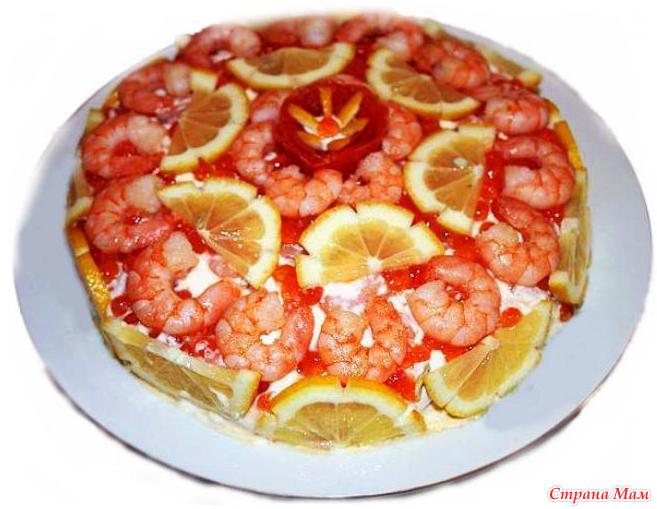 Перед подачей на стол украсить оставшимися креветками, ломтиками лимона, зеленью, "розочкой" из помидора.