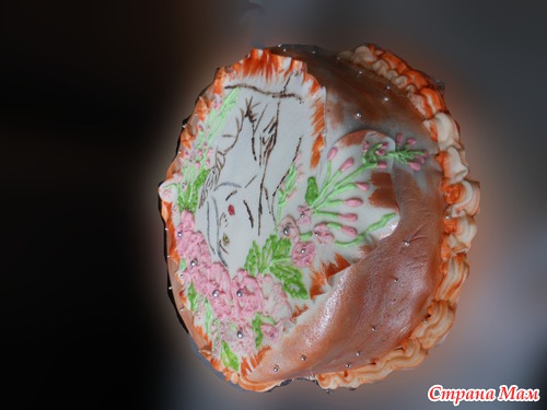 Внутри шоколад на кипятке и йогуртовий крем с персиками покрыт мастикой -шоколадномармишковой.