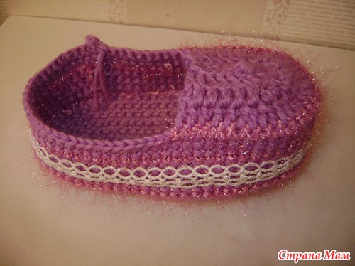 Между двумя рядами "Кристалла" нашиваем тесьму. Затем в носочной части отмечаем 36 столбиков иголочками для шитья, опять переворачиваем на левую сторону и вяжем 36 столбиков без накида, опять получая ровненький загиб. Затем переходим на правую сторону и основными нитками вяжем в носочной части три воздушных петли,5 столбиков с накидом, 12 раз по два провязанных вместе столбика с одним накидом и еще 6 столбиков с одним накидом