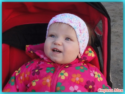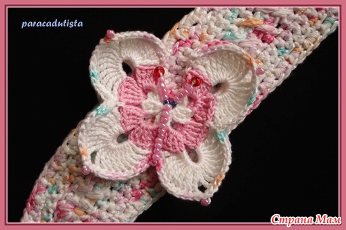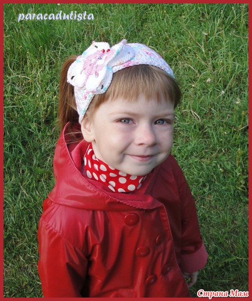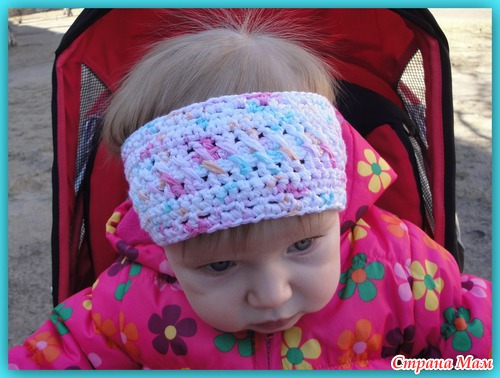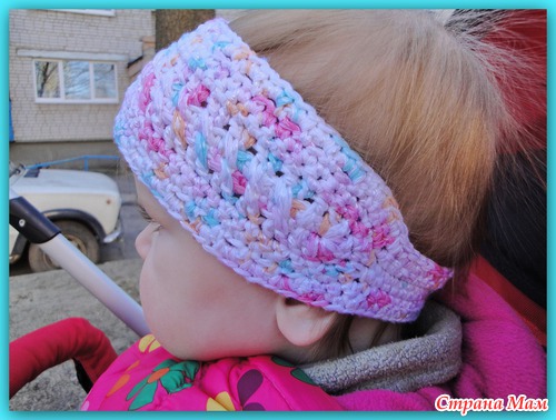 Это повязка связана на мою маленькую дочку, которой скоро будет год, но по размеру она подошла и на мою трёхлетнюю дочь. Поэтому количество петель пишу, как для оригинала.