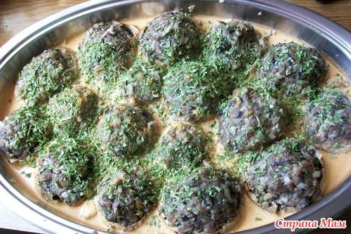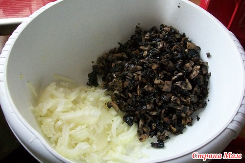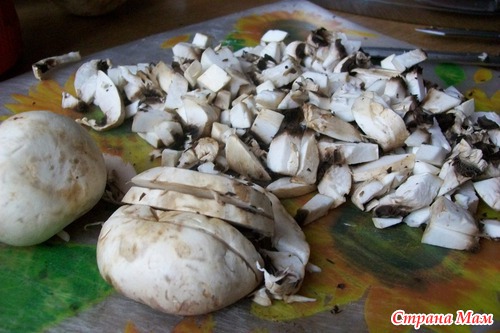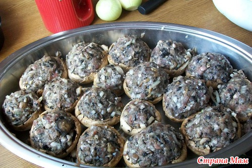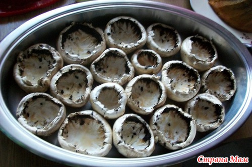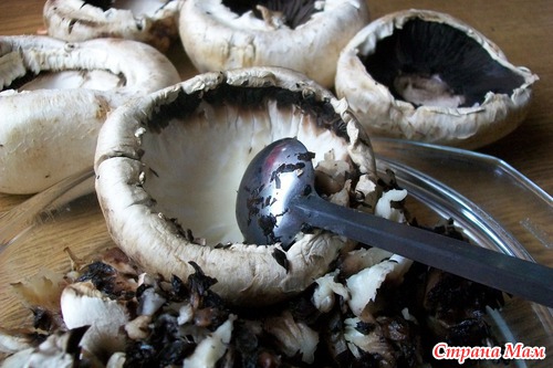 выцарапываем серединку ( если целые использовать, особенно в духовке - грибы морщатся, теряя влагу, и выдавливают из себя начинку... )