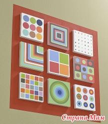 несколько квадратов из пенопласта хорошего качества, сверху - картон, на него с помощью трафарета наносится рисунок - соединяется в композицию двусторонним скотчем к контрастной основе, которая затем крепится к стене