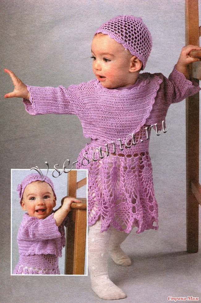 Начинайте вязание с кокетки. Выполните цепочку из возд. п., равную объему груди (примерно 46 см), и далее вяжите столбиками с/н кокетку высотой 12 см. Замкните кокетку соед. ст. Следующий ряд: вяжите *ст. б/н, 4 возд. п.*, повторяйте *-* (должно получиться 24 «окошечка» из 4 возд. п.). Далее вяжите юбку узором «Ананас».