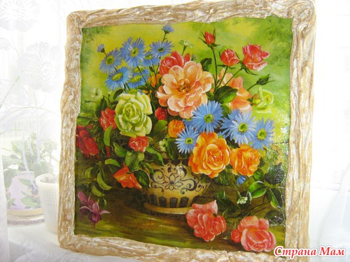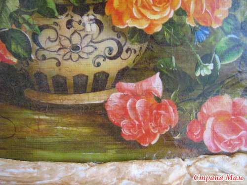 Салфетку сначала наклеила на канву, затем на бак фанеру, 2х шаговый кракелюр