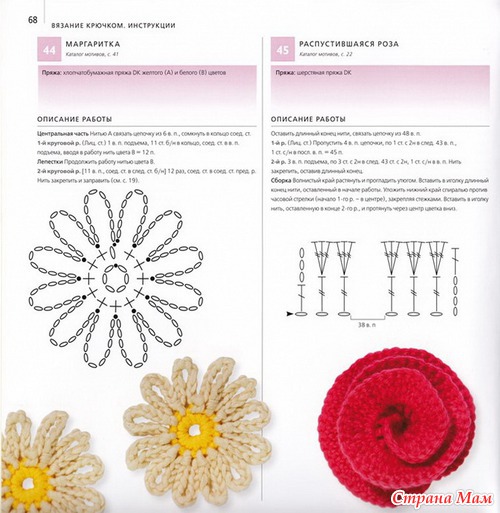 При моём крючке, пряже и плотности вязания я выполнила круг на 90 петель. ( Обхват головы 56 см) Далее вязала ровно и примеряла. Когда захотелось сделать расширение на поля, то перешла на крючок немного поменьше и провязала два ряда СБН,(90 петель) в следующем 3 ряду полей сделала прибавку в каждый 5-ый СБН (108петель). 4,5,6 ряд вязала без прибавок, а в 7-ом ряду сделала прибавку в каждый 6-ой СБН (126 петель). Расположила эту прибавку относительно предыдущей прибавки 3-го ряда посередине. 8,9,10 ряды без прибавок. Закончила вязание полей 5-ю соединительными столбиками. После сделала обвязку отделочной нитью СБН. Связала цветок строго по схеме распустившейся розы и тоже обвязала его СБН отделочной нитью.
