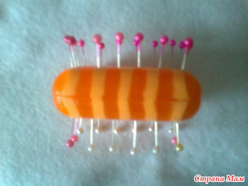 Берем кусочек мыла и втыкаем иголки с верху и снизу.