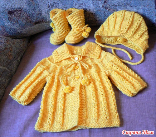 Жакетик из журнала Sabrina-Baby, №4 за 2002 год, шапочку связала без описания таким же узором, как на жакете, пинетки-сапожки по описанию из инета (где-то и здесь видела такое описание