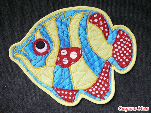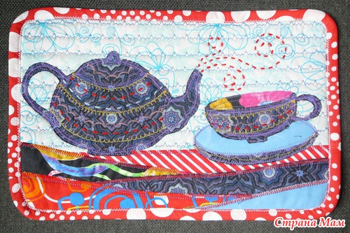 1. основной фон, декоративная стёжка (ватин+ ткань). 2. Разноцветные полоски в нижней части, декоративна отстрочка. 3. чайник. 4. блюдце. 5. чашка Накладываю на фон и отстрачиваю по краю, потом декоративные строчки. 6. подкладка соединяется с основной деталью обрабатывается косой бейкой.