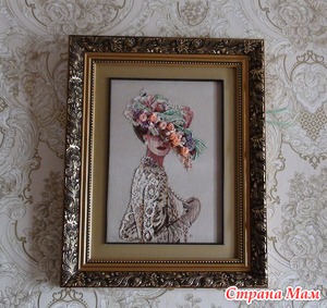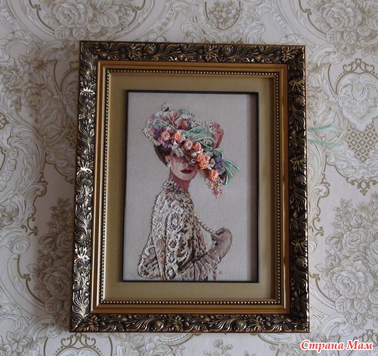 Ну очень красивая работа и оформление достойное. Я тоже собираюсь вышивать эту даму, уже даже набор купила. Но пока боюсь, что сложновато будет. Тренируюсь на более легких вариантах