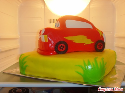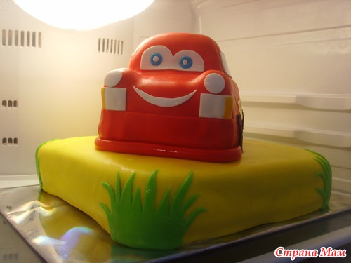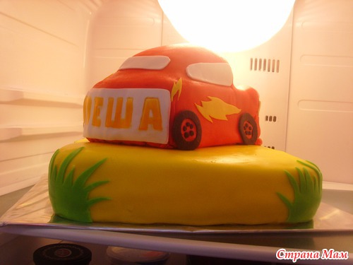 В машине: Австрийские медовые коржи + крем: сливки, сметана, вареная сгущенка. В нижнем: бисквит на крахмале + бисквит из Трех шоколадов + крем: сливки, творожный сыр, персики + пропитка: шоколадный коктейль с молоком. Под мастику заварной крем на белом шоколаде, мастика покупная.