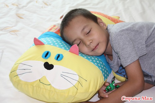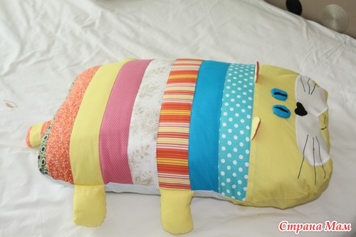 в интернете есть выкройка такого котика. Я сама на глаз сделала. Хотелось побольше его сделать. Да и подушка у меня большая прямоугольная, поэтому он такой толстяк. И еще, я сделала его как наволочку на замочке, можно снимать и стирать.