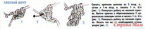 Описание работы: для пояса на спицы №4 набрать 148 п., связать 25 см резинкой и петли закрыть. Для воротника на спицы № 4 набрать 135 п., связать 35 см резинкой и петли закрыть. Крючком № 2,5 связать колечки из плоских шнуров (см. рисунок), соединяя их между собой в сетку по выкройке. Выполнить боковые швы воротника и пояса и пришить их к сетке из колечек.