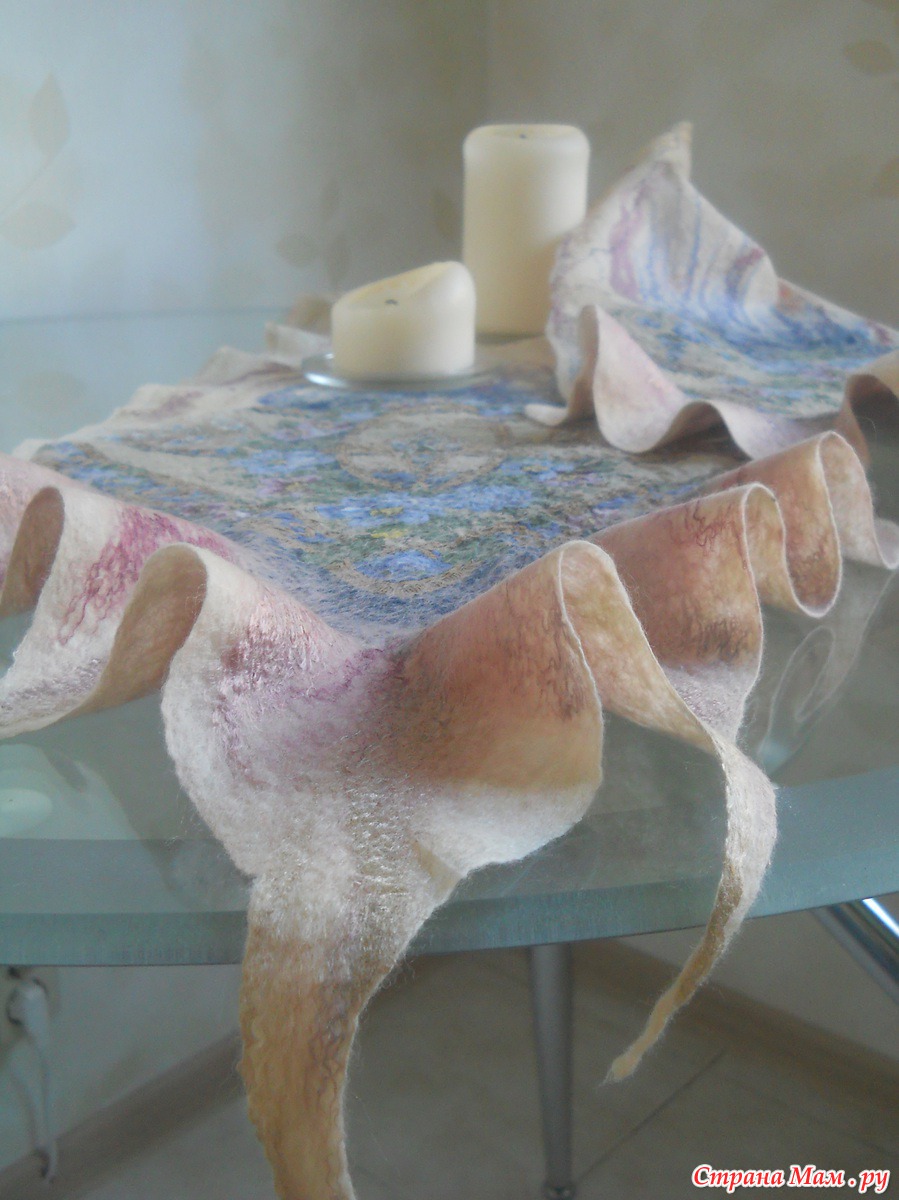 Доброго дня всем!!! Хочу вот на суд людской выставить мой первый опыт в мокром валянии. Это тонкий шарфик из австралийского мериноса, с использованием шелка павло-пасадских платков, волокон шелка, туссы, крапивы и прочего.. прочего... Должна сказать... что сам процесс... сродни волшебству... потому как из хаоса шерсти... шелка... прочих ниточек и веревочек... все это... выкладывается в подобные чудесные штуки... Ах!!!