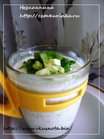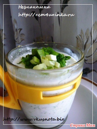 Смешать кефир со сметаной. Добавить мелко натёртый огурчик и чеснок.