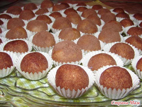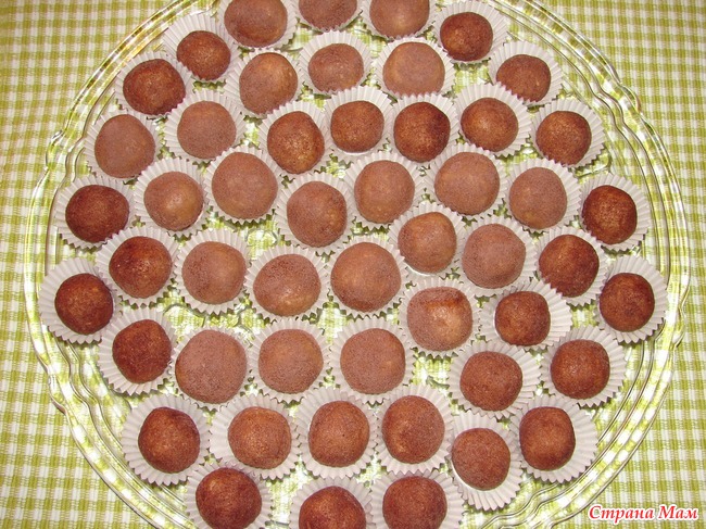 1 пачка (500гр.) сливочного печенья, растолочь мелко, туда вылить 1 банку сгущённого молока, и 50гр. сливочного масла, всё перемешать скатать шарики, и обвалять их в порошке какао.