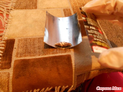 Для создания этих бусин нам понадобится жемчужница. Вещица, конечно, интересная, но мы попробуем обойтись подручными средствами. Я сегодня нарыла у себя банку от кофе))) Вырезаем нужные нам кусочки (берегите руки от порезов), основание жемчужницы делаем больше, а крышечку меньше. Вот так