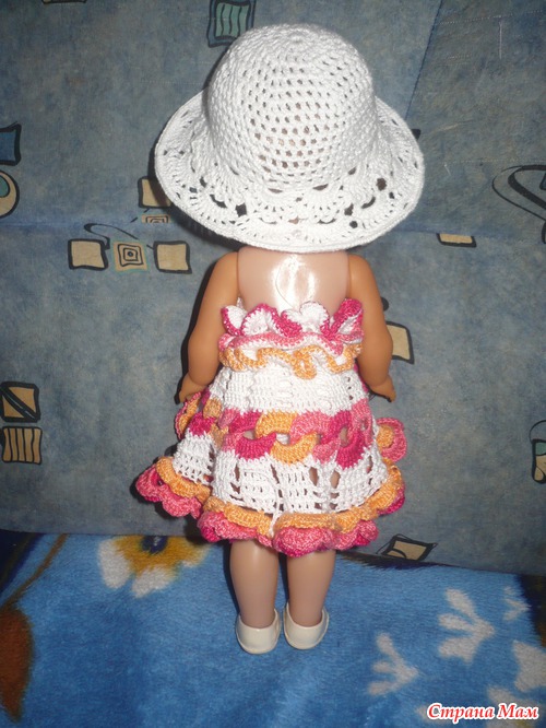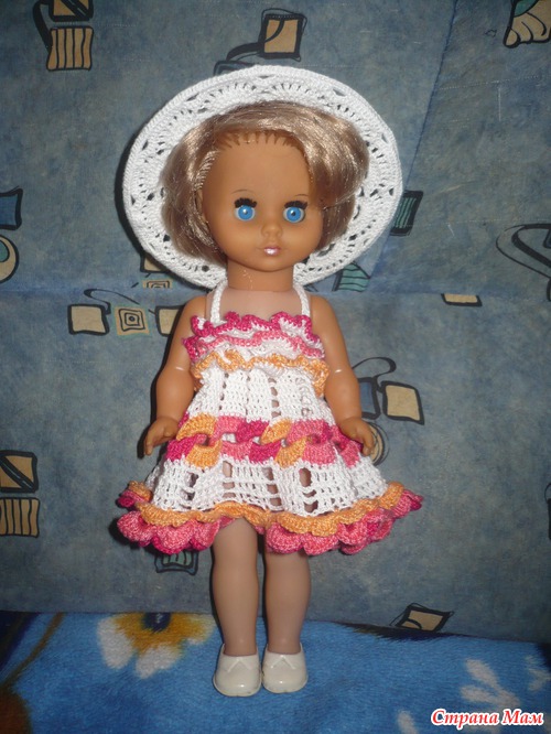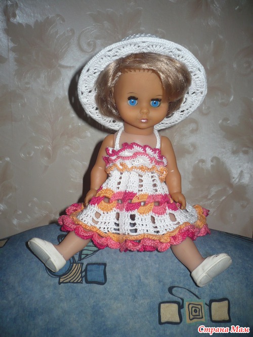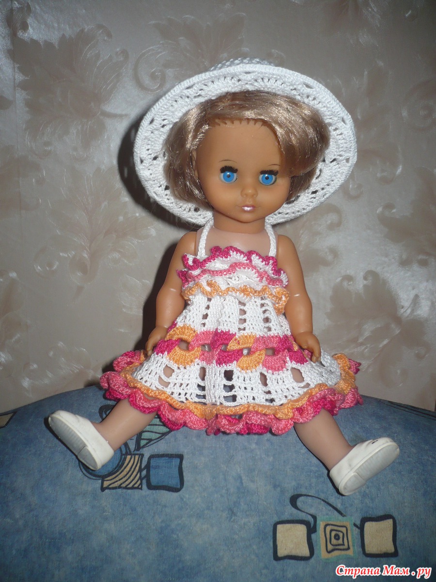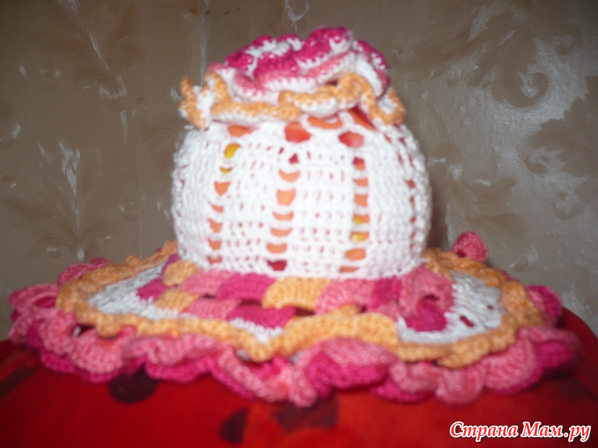 К шляпке планировала белое платье для куклы связать, но перебирала дочкины вещи, которые на нее маленькие и наткнулась на вязанную шляпку (свекровь вязала) и решила переделать ее в платье для куклы.