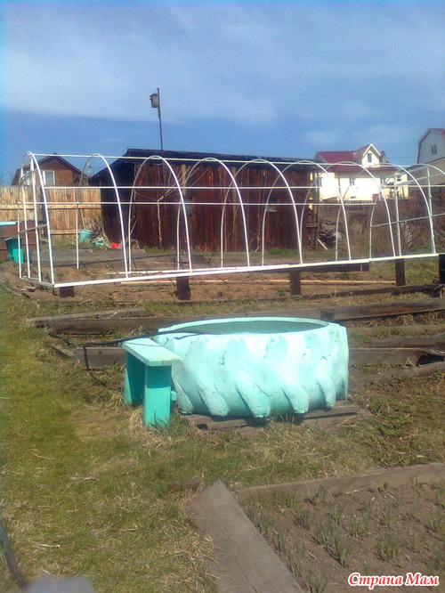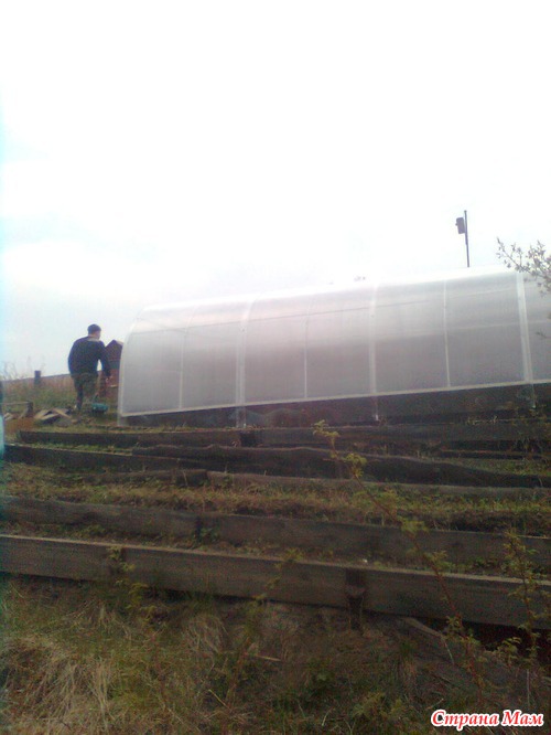 А ещё мы установили за эту неделю поликарбонатную теплицу. Сначала каркас: