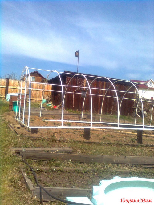 А ещё мы установили за эту неделю поликарбонатную теплицу. Сначала каркас:
