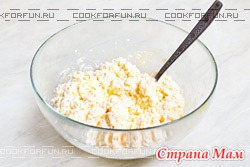 Для приготовления теста используйте 3/4 всего творога (оставшийся творог отложить). Творог хорошо перемешать с яйцами и сахаром.