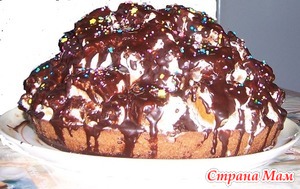 Яйца взбить с сахаром, добавить остальные ингредиенты. Тесто разделить на 2 части, в одну всыпать 2-3 ст. ложки какао. Испечь 2 коржа. Один корж (я беру коричневый) разрезать на небольшие квадраты (приблизительно 2х2), обмакнуть квадратики в крем (сметана взбитая с сахаром) и горкой выложить на белый корж: укладываю первый слой, посыпаю изюмом, орехами или ягодами, фруктами, потом так же и другие слои. Затем сверху заливаю растопленным шоколадом. Можно взять для этого шоколадку, а можно приготовить шоколадную глазурь: 6 ст. л. сметаны, 5 ст. л. сахара, 5 ч. л. какао; варить на медленном огне 5-10 минут, потом добавить 30 гр. сливочного масла, ещё поварить 3-5 минут. Можно украсить ещё сверху разноцветной посыпкой для выпечки или кондитерским шприцем сделать из взбитых белков цветочки, листики и т. д. Ваша фантазия, я думаю, подскажет!