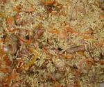 6.рис ещё раз промыть и всыпать в мясо, добавить чеснок целой головкой в шкурке.