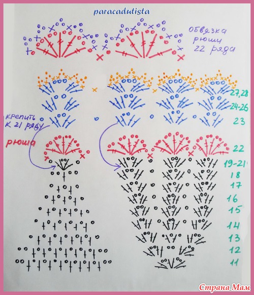 Вторая панамка связана по этому МК https://www.stranamam.ru/post/1357127/#com7271991 с моими доработками. Для удобства моего и вашего я нарисовала схему, адаптированную под меня. Нитки также вьолет, крючок №1. Так как малышка Доминика срывает с себя все шляпы и панамы, я пришила атласные ленты для завязок.