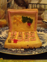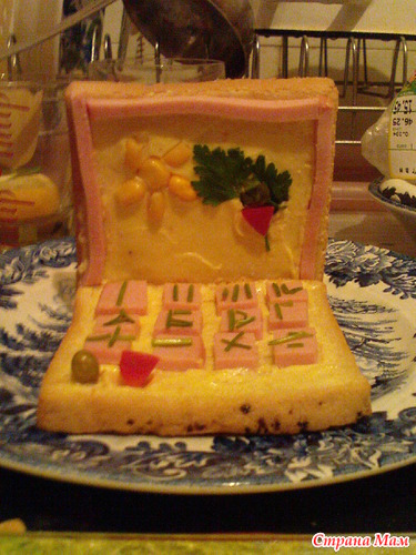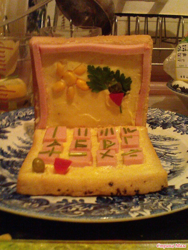 На хлеб с маслом выкладываю кусочки варёной колбасы - это клавиатура. Горошек и кусочек перца - индикаторы. Цифры и буквы - стебельки петрушки. На дисплее рамка из полосок колбаски, картинка из консервированной кукурузы петрушки и кусочка перца. Соединяем ноутбук соломкой.