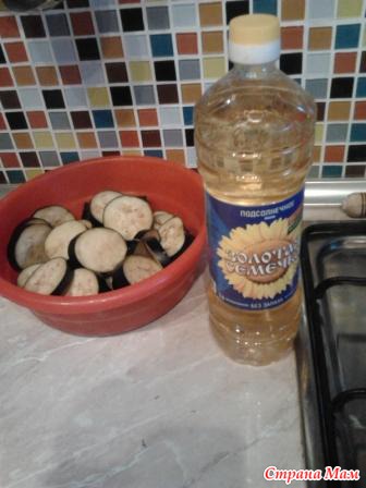 Баклажаны масло любят, поэтому я налила на сковородку масла и еще приготовила неоткрытую бутылочку (на всякий случай).