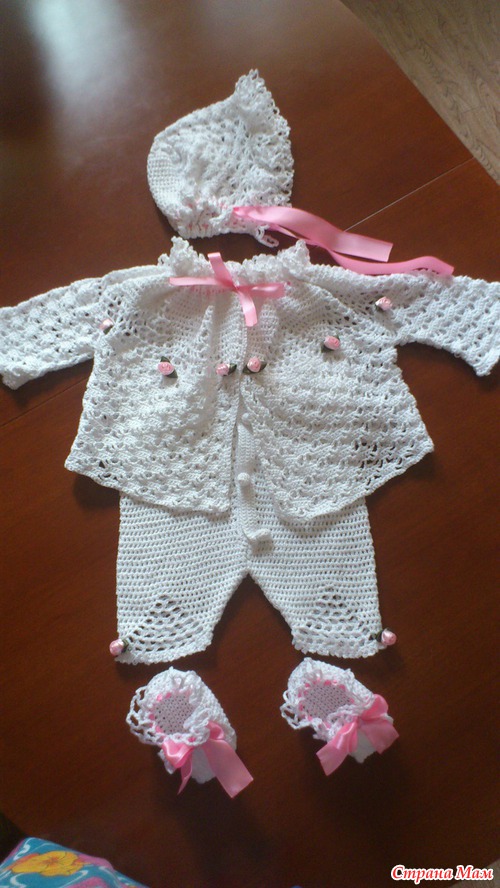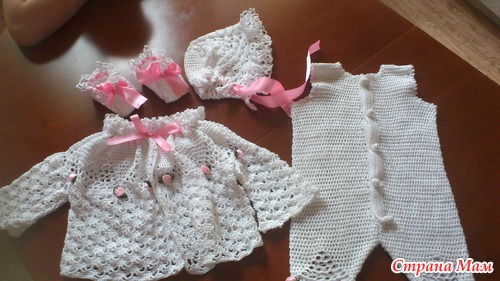Красивейший комплектик! На днях собираюсь тоже такой начать вязать, попросили на малыша 1-2 месяцев, для крестин. И еще меня попросили связать так, чтобы на памперс налазил комбинезончик. Подскажите, если по схеме вязать, в попке не узкий получается?