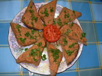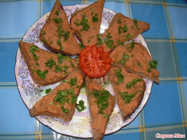 ПРОДУКТЫ: 3 кабачка, 3 баклажана, 3 помидора, 2 зубчика чеснока, буханка черного хлеба, помидор и зелень для украшения, соль, перец по вкусу.