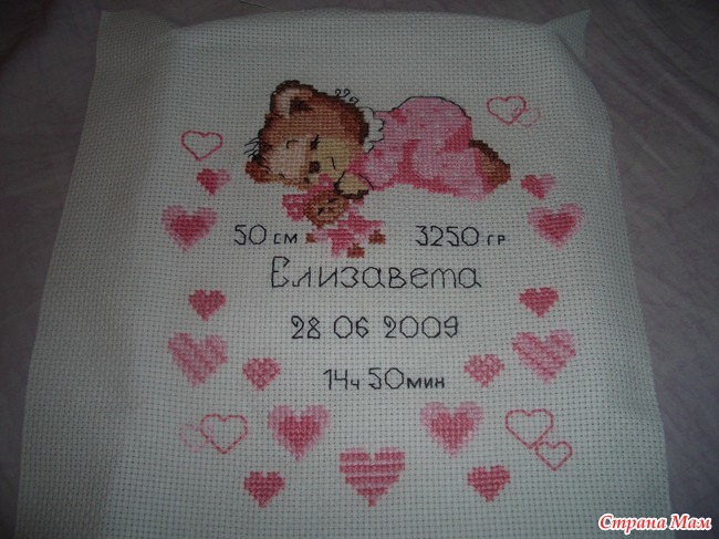Вот, собственно мой подарок, счастья полные штаны, сама я только смотрю в сторону вышивки со страхом и трепетом, а тут, моя мечта метрика Лизкину моему, да еще такая нежная, такая прям
