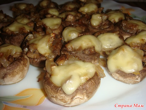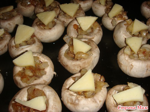 в каждую шляпку выкладываем начинку и кусочек сыра