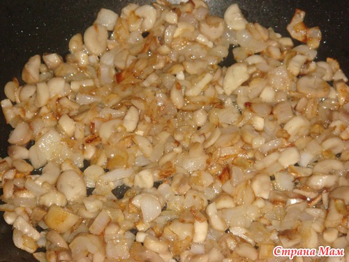 добавляем мелко порезанные ножки наших грибочков и жарим до готовности, не забываем посолить и поперчить по вкусу