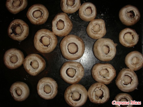 шампиньоны промываем, ножки отрываем, шляпки выкладываем на противень, капаем в каждую шляпку растительное или оливковое масло(на ваш вкус), немного присаливаем.