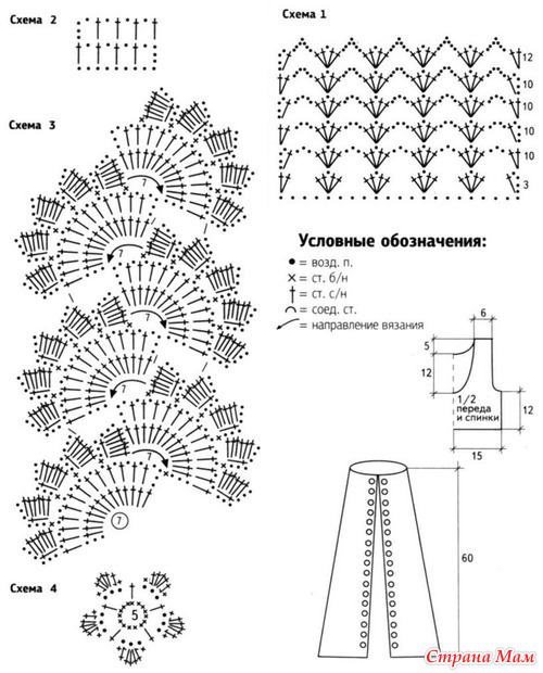 Наберите 4 возд. п. и вяжите 11 рядов узором по схеме 1, прибавляя в каждом ряду no 1 п. (должно получиться подобие мешочка). Верхний край обвяжите «пико» столбиками б/н. Затем свяжите ручку следующим образом: свяжите цепочку из возд. п. длиной 24 см, обвяжите ее «пико» с обеих сторон. Сшейте подклад для сумки. Расшейте сумочку пайетками и бисером.