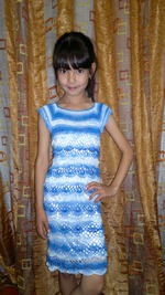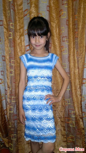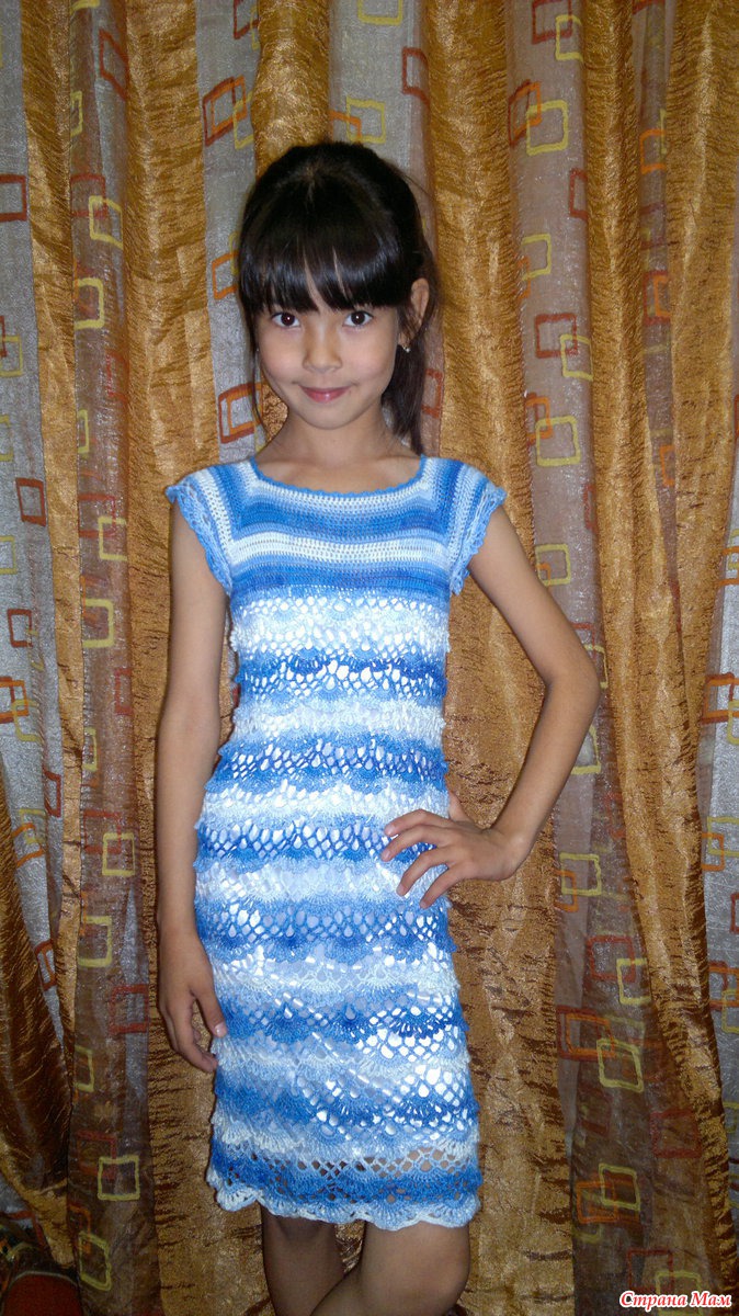 Очаровашка! Платье супер! Вот так и я вяжу, в прошлом году связала платье было как раз, постирали и платье выросло даже в этом году длинное. Нитки - наш Ирис. Теперь ждет когда хозяйка дорастет. Дочке не терпится оденет дома покружится в нем покружится и на полку. Муж думал я второе большое связала.